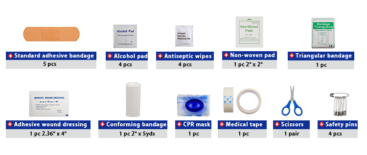 Включает в себя основные предметы первой помощи при легких травмах и ежедневном использовании.