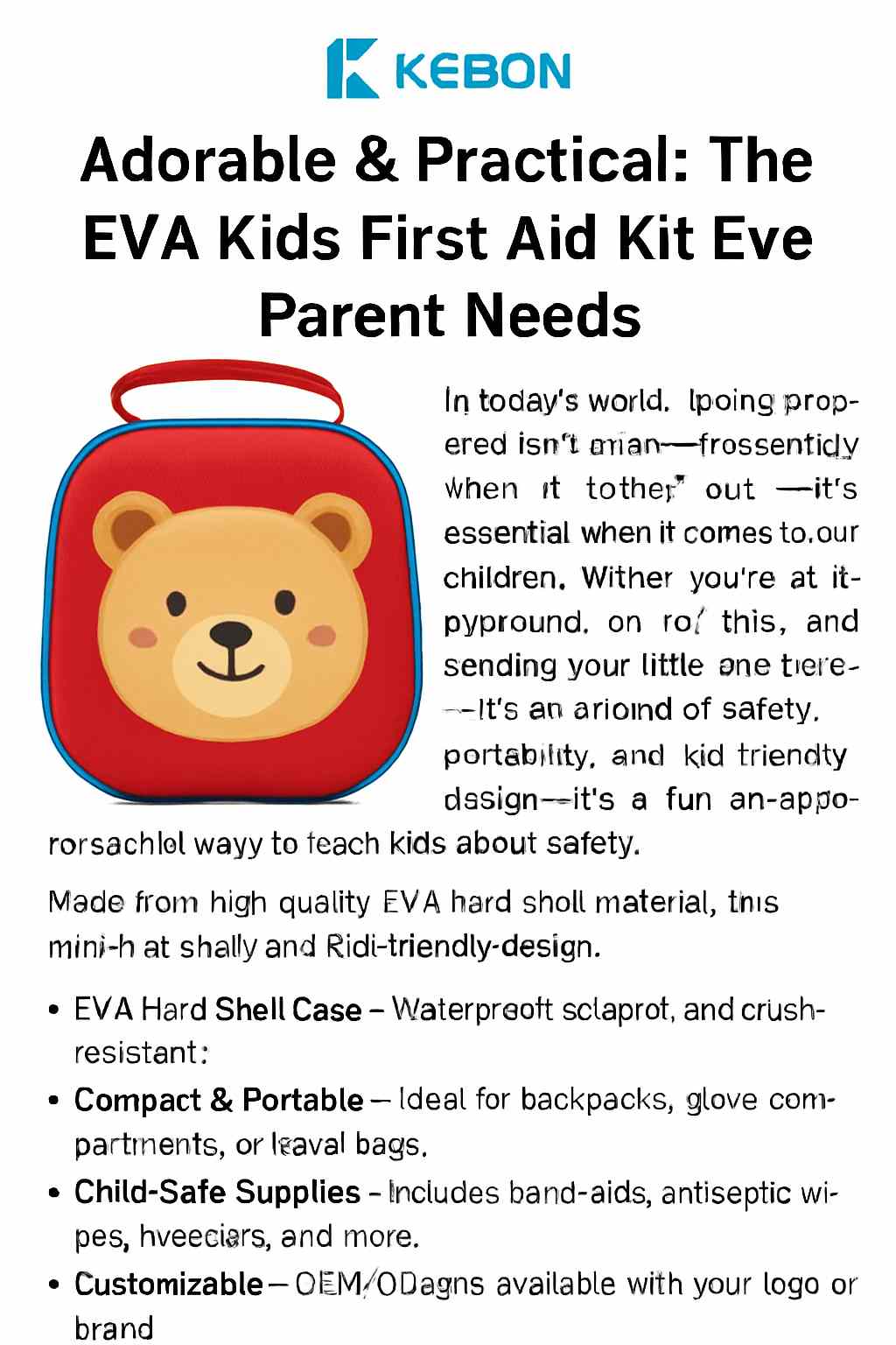В современном мире, быть подготовленным не просто умным - это важно, особенно когда речь идет о наших детях. Независимо от того, на игровой площадке, в поездке или отправляете своего малыша в школу, несчастные случаи могут произойти. Вот почему Kebon с гордостью представляет симпатичный комплект First Aid Eva для детей-идеальное сочетание безопасности, портативности и дизайна, подходящего для детей.